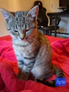 Ik, Ayla, ben de grote zorgzame zus met mijn prachtige tijgerprint. Ik was en poets mijn broer en zus proper, en ik spin al wanneer je nog maar naar mij kijkt. 🥰 Ik hou van spelen en van gezellig bij jou liggen.