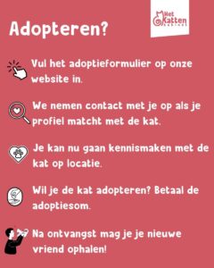 Lees hier de extra informatie over onze adoptievoorwaarden en -procedure en vul hier het adoptieformulier in. Onze mailtjes komen regelmatig terecht in de spam-folder, check deze regelmatig indien je ons contacteerde.