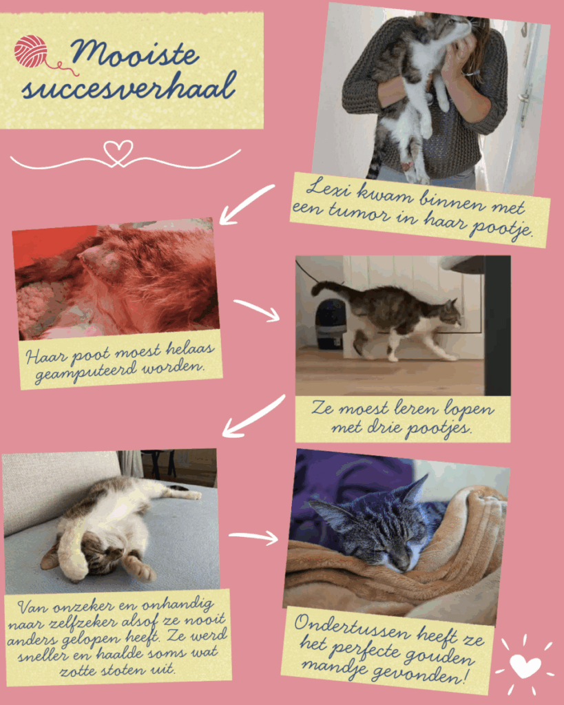 Lexi, mijn vijfde opvangkat, heeft me extra geraakt omdat ze bij ons is gekomen met een tumor in haar pootje. We hebben haar pootje moeten laten amputeren en ik vond het heel erg dat ze hier doorheen moest. Het is zoโn lieve en zachte kat! Ondertussen stelt ze het goed en ben ik fier op haar kracht en moed. Het was extra fijn om te mogen zien hoe ze openbloeide en heel zelfzeker met drie pootjes steeds meer op ontdekking ging. Ondertussen heeft ze het perfecte gouden mandje gevonden!